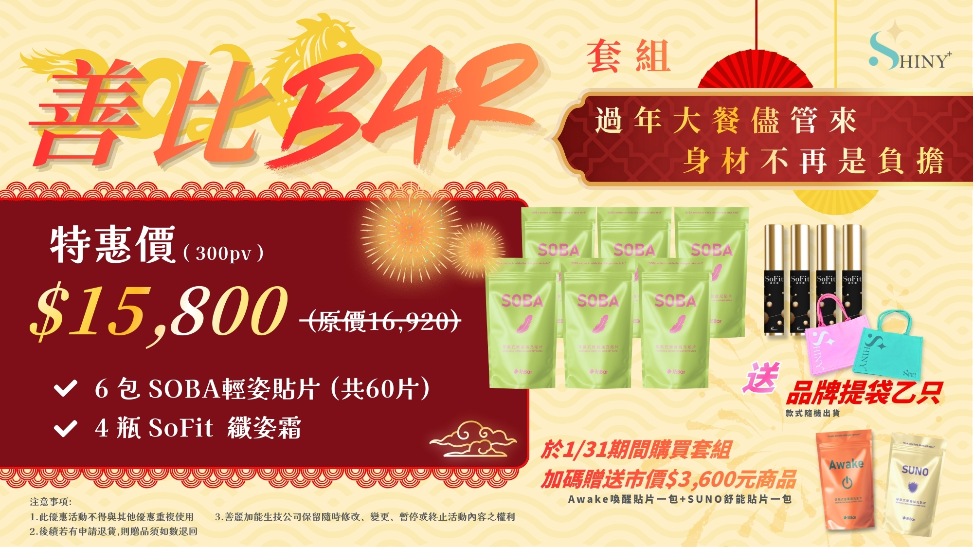 贈品明細:品牌購物袋-粉x1,貼Bar -Awake喚醒貼片x1,貼Bar-SUNO舒能貼片x1